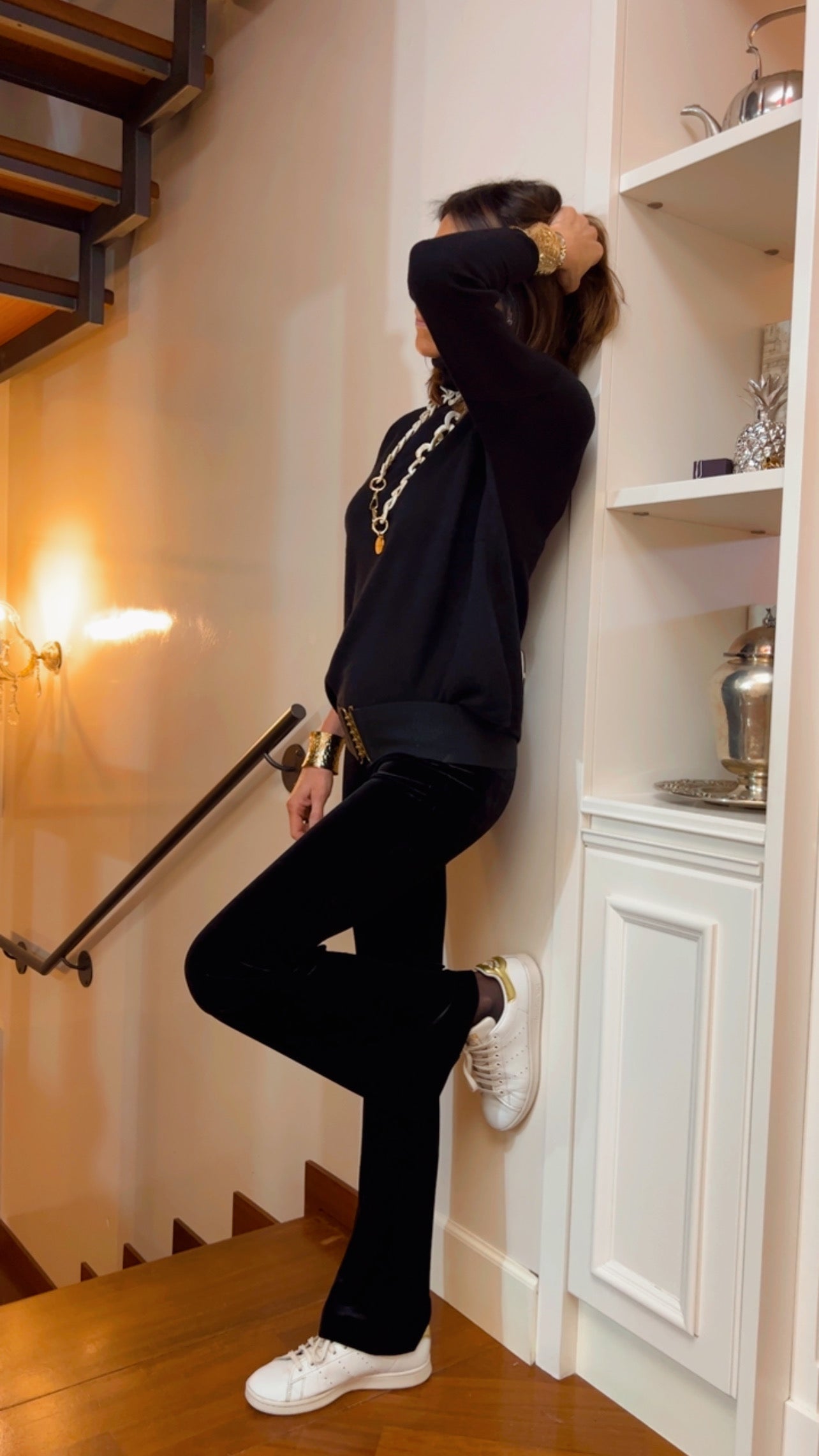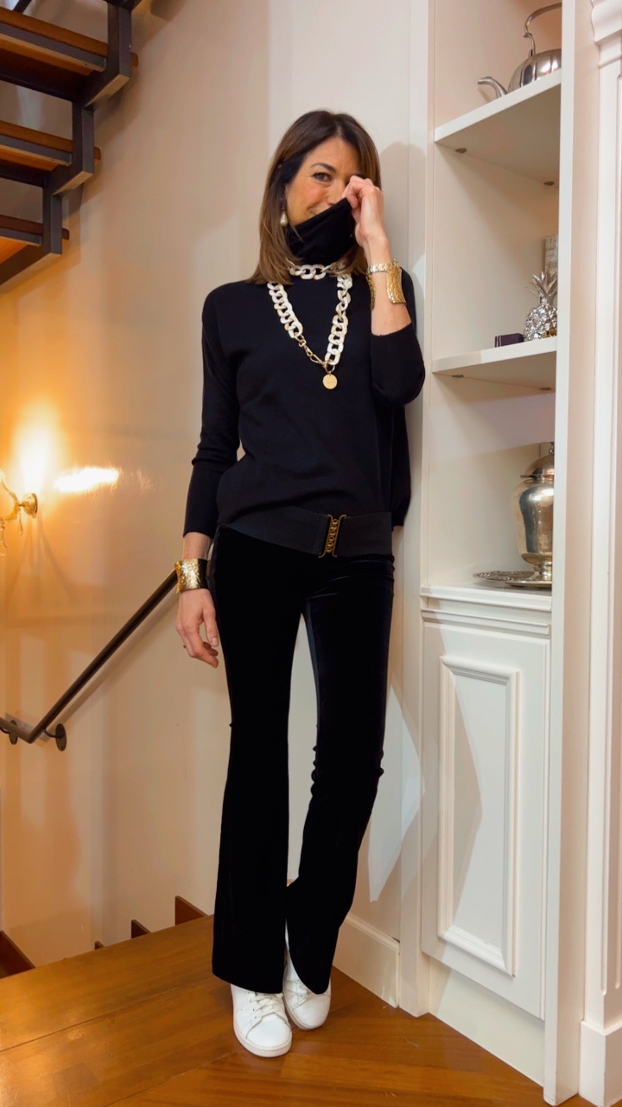 Il pull rilassato e morbido si abbina a una gonna preziosa, a pantaloni morbidi, in un apparente contrasto di stili che risulta molto contemporaneo e cool