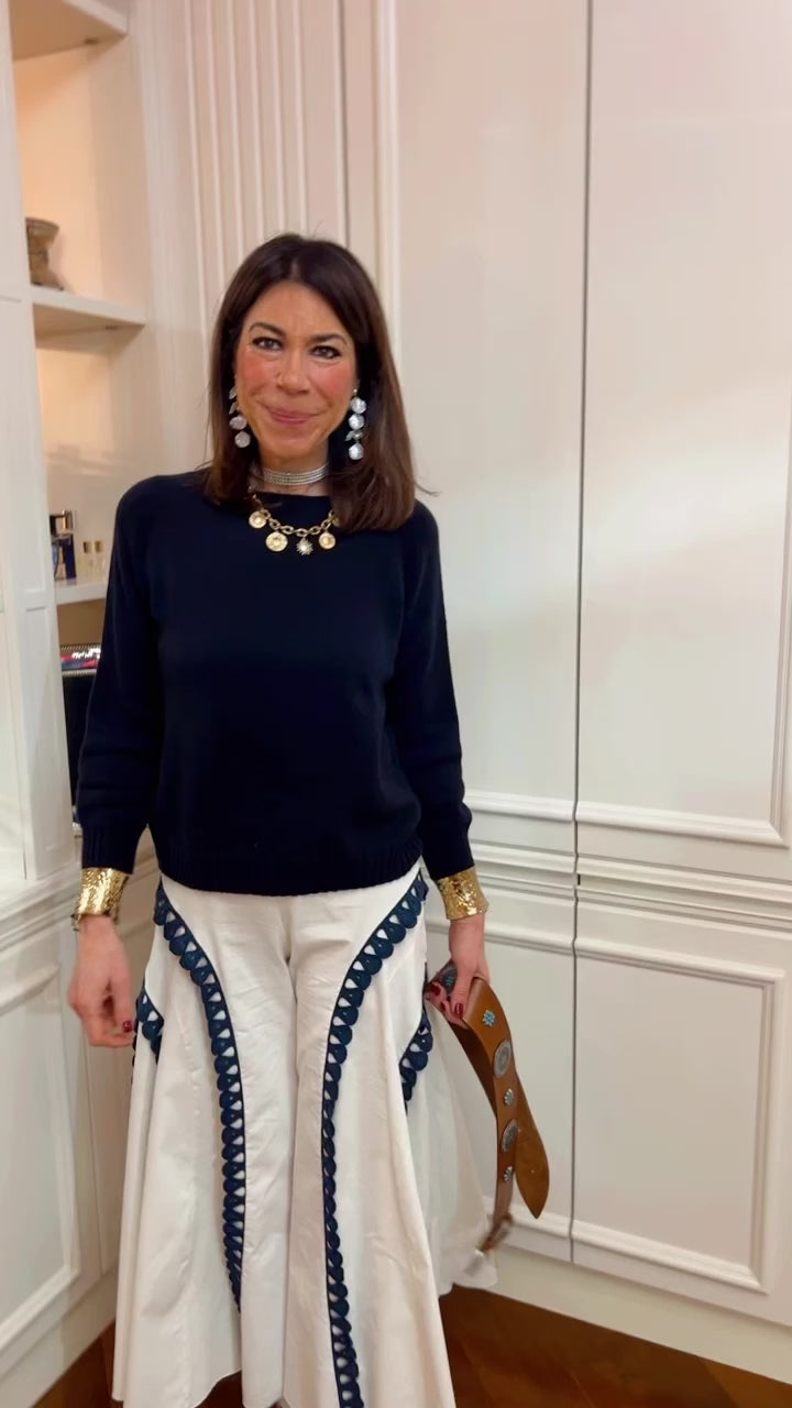 Il pull rilassato e morbido si abbina a una gonna preziosa, a pantaloni morbidi, in un apparente contrasto di stili che risulta molto contemporaneo e cool