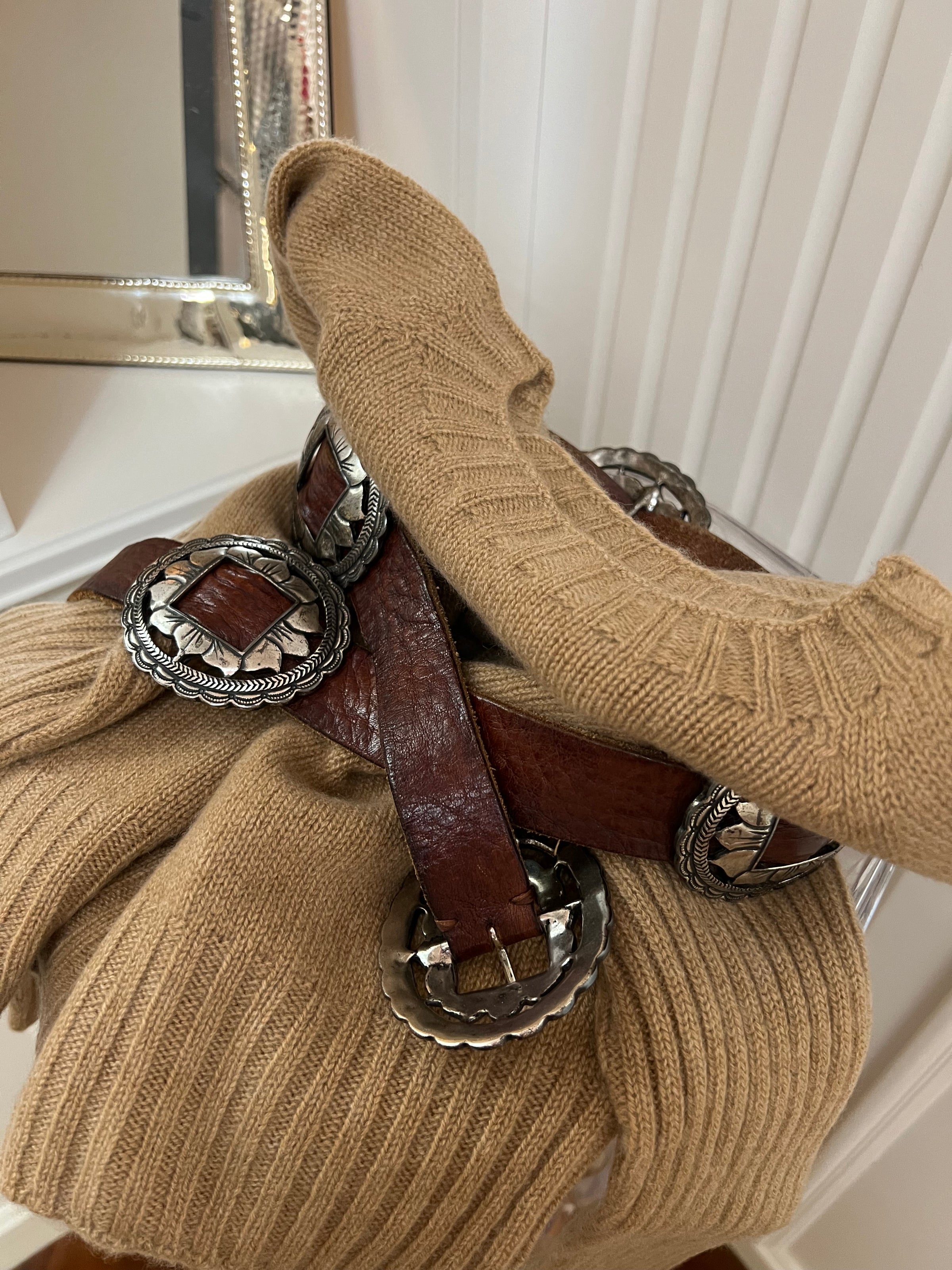 Impreziosito da cinture di grande effetto, in metallo o cuoio con decori, un modo intelligente per modellare i maglioni e creare una silhouette più slanciata