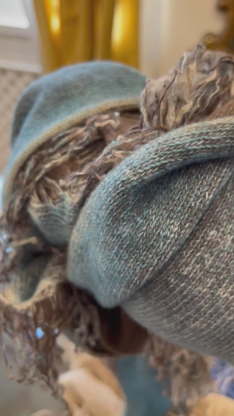 Il cashmere impalpabile e pieno accarezza la pelle come un soffio caldo, mentre il colore racconta emozioni in movimento: profondità, luce, mistero. Indossarlo è come avvolgersi in un dipinto, sentire l'arte che respira insieme a te.