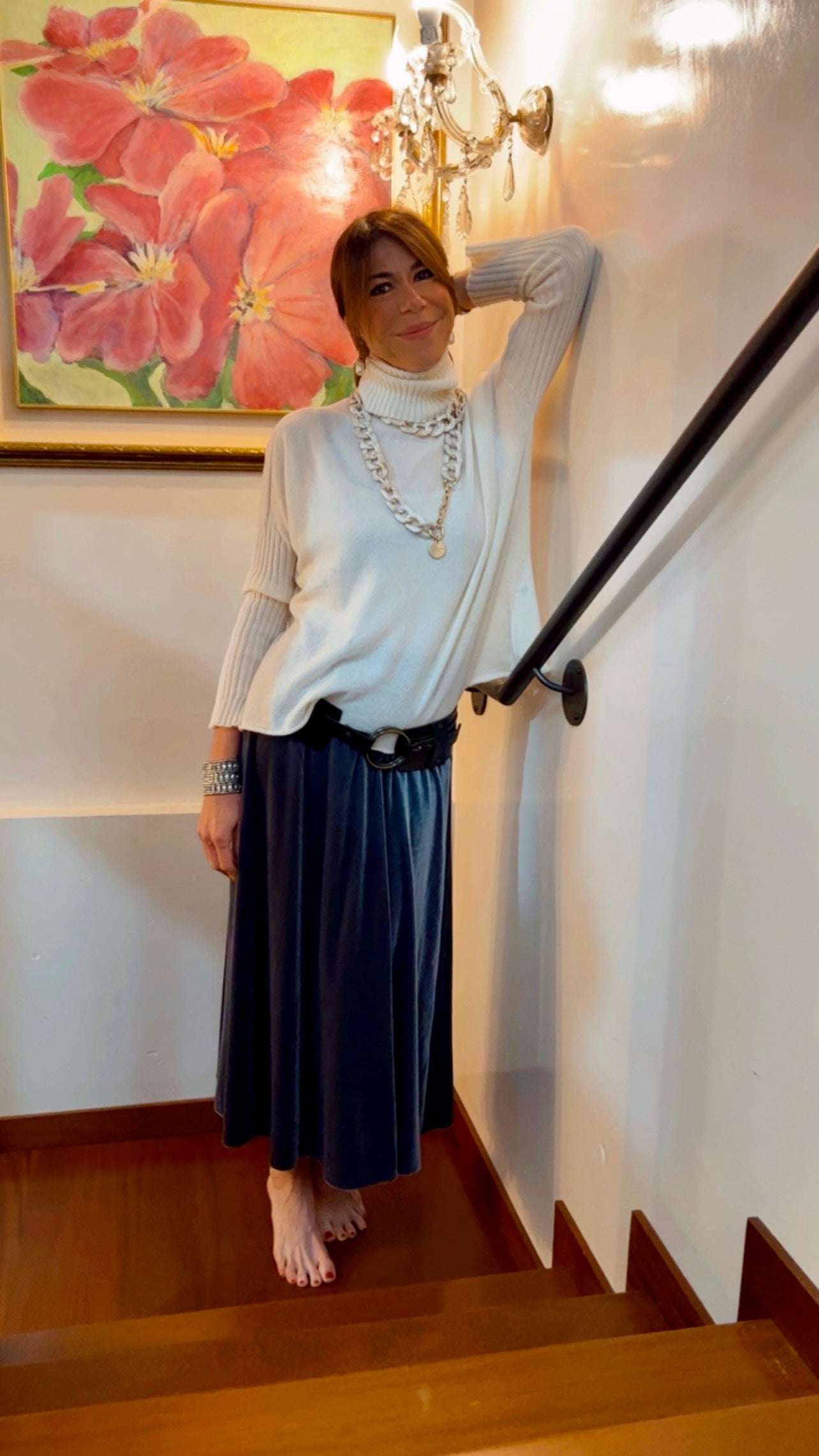 Si chiama DOLCE COSTA, il dolcevita più bello che ci sia! Un delizioso contrasto di lavorazioni con corpo in maglia rasata, collo e maniche a coste.